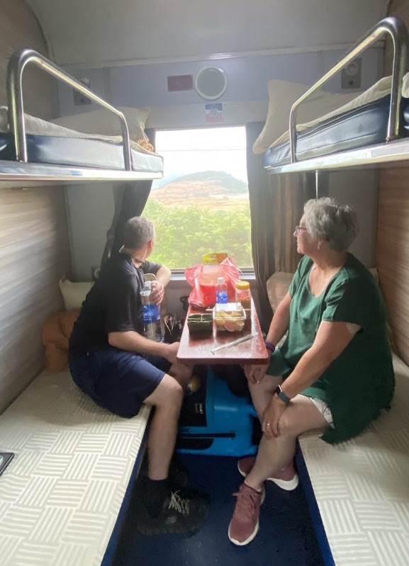 The train got to the Da Nang Station a bit late. We dragged our luggage across a train track to get to the platform. Some people got off the train, we got on. The cabin had four beds, we booked three beds for three adults as Morgan did not require a ticket. The remaining bed was empty but a train worker said that I could pay coffee money for her to move the person that booked that bed to another cabin so we would have the cabin to ourselves. I gave her 30,000VND but I was not sure if the bed was actually booked or my 30,000VND was given away in vain.